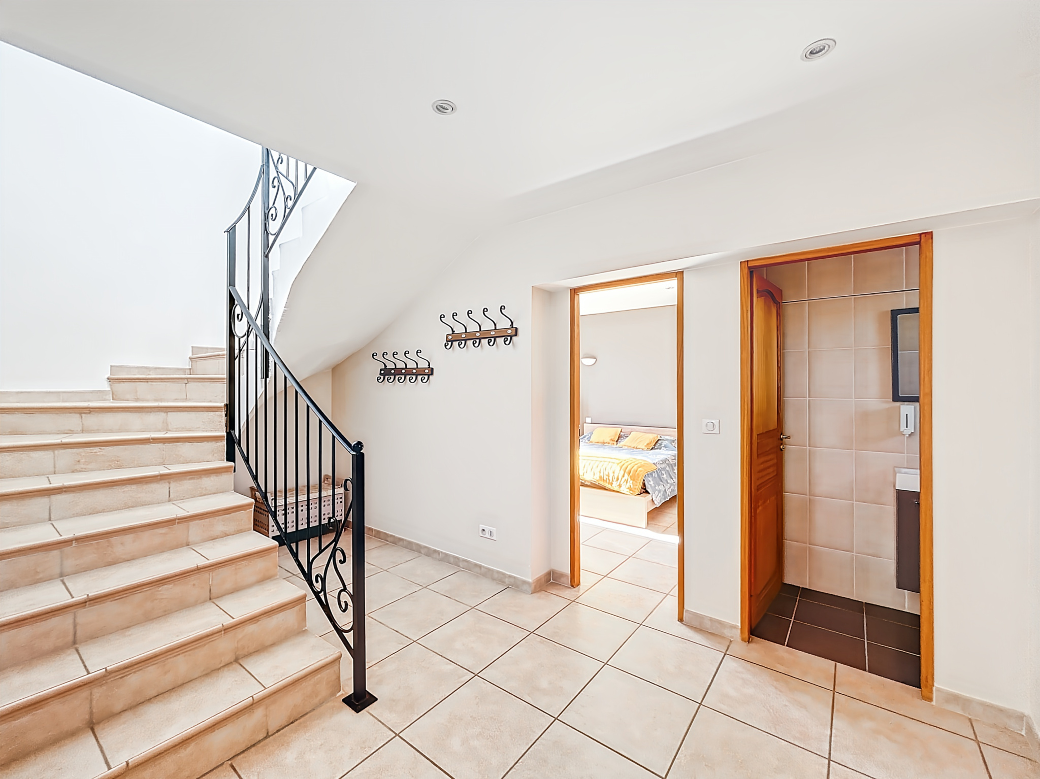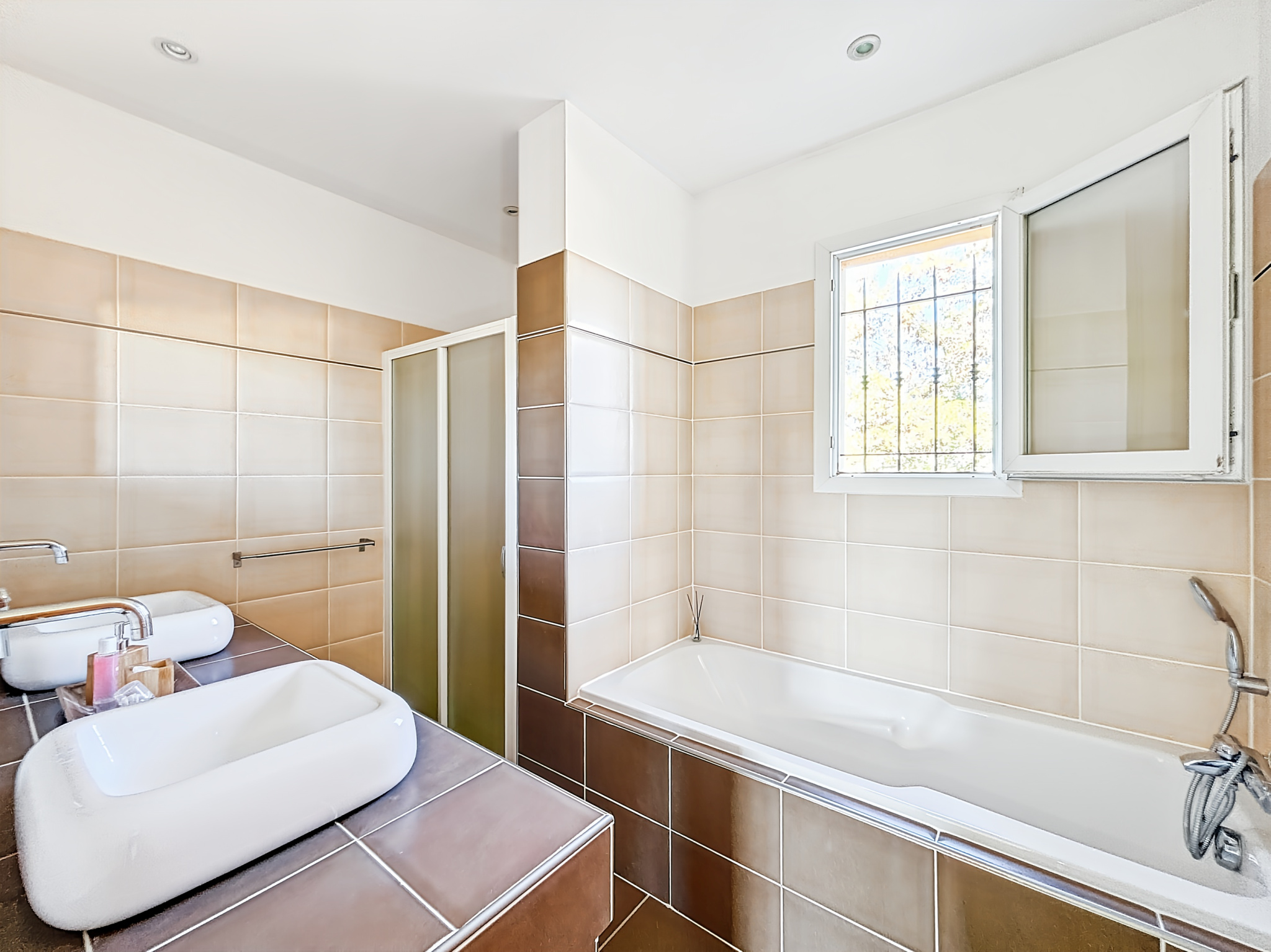 À l’étage, trois chambres dont une avec dressing aménagé et placards dans les deux autres, ainsi qu’une grande salle de bain avec double vasque, baignoire et douche.